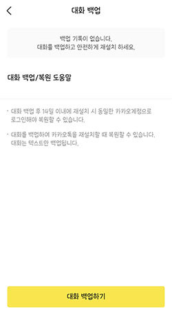 그리고 하단에 노란 박스 ‘대화 백업하기'를 눌러 진행합니다.