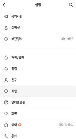 먼저 카카오톡을 실행한 후 설정으로 들어가 ‘채팅'탭을 선택합니다.