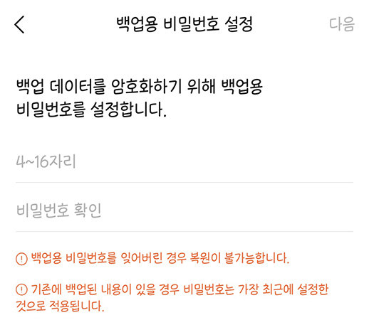 이 때 백업용 비밀번호를 설정하게 되는데 백업용 비밀번호를 설정할 때는 신중해야 합니다. 왜냐하면 백업용 비밀번호를 잃어버린 경우에는 복원이 불가능하기 때문입니다. 이 방법의 또 다른 단점은 백업의 유효기간이 2주, 14일로 정해져있다는 점입니다. 그렇게 격주로 백업을 해야해야하기 때문에 번거로움이 있습니다. 그리고 날짜를 잊어버리거나 헛갈려서 14일이 지나버린 다면 백업해둔 정보는 지워지게 됩니다.